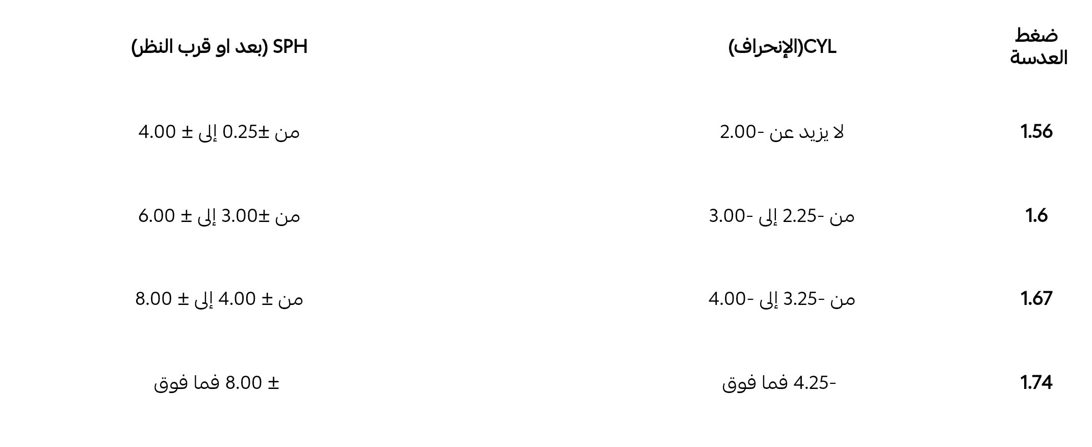 في حال كان قياس النظر ±3.00 أو أعلى، ننصح باختيار عدسة مضغوطة لتقليل السماكة وتحسين شكل العدسة.